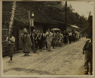 写真のように、かつてはこの日、寺での大護摩修行に先立ち、僧を先頭に念仏講(今はご詠歌)の人々や稚児の行列が出てたいへん賑わった。今は11月18日の「木まち」と呼ばれる秋の縁日に出るようになった。この「木まち」にあわせて植木市が開かれる。「木まち」の「まち」とは、“賑やかなところ、市”を意味する。もともとは、馬の売買をする馬市であったが、戦後、その需要がなくなると植木市として賑わうようになった。念仏講はなくなり、今はご詠歌の人々が先導している。ご詠歌の人々は12人ほどだが、週1回集まって練習しているということだ。