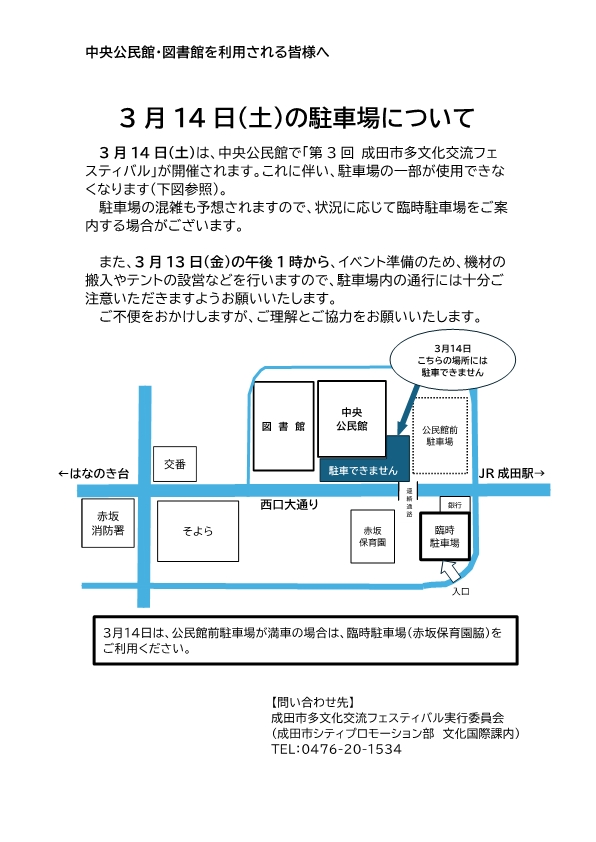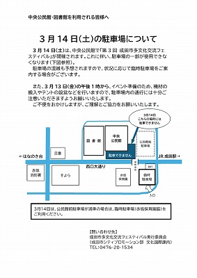 2026(令和8)年3月14日(土曜日)は中央公民館を会場に「第3回成田市多文化交流フェスティバル」が開催されるため、駐車場の混雑が予想されます。状況に応じて臨時駐車場をご案内する場合もございますので、あらかじめご了承ください。