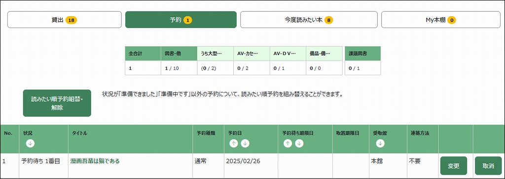 「変更」「取消」ボタンをクリックします。連絡方法、受取館、予約待ち期限日を変更できます。