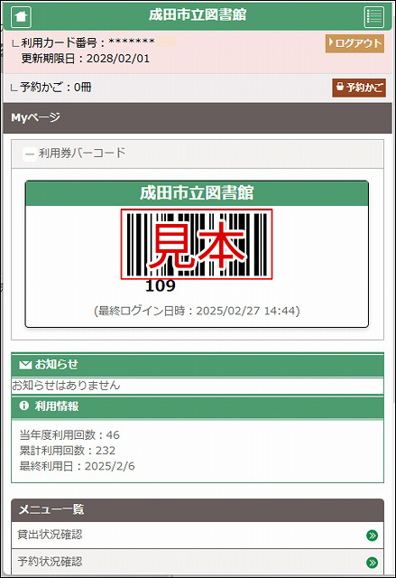 利用カードのバーコード表示画面