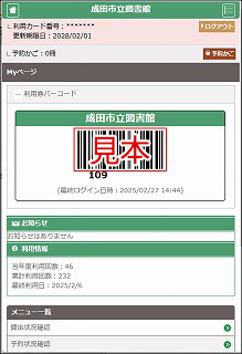 資料の貸出の際に、お手持ちのスマートフォン等にバーコードを表示させることで、利用カードの代わりとして使用できます。