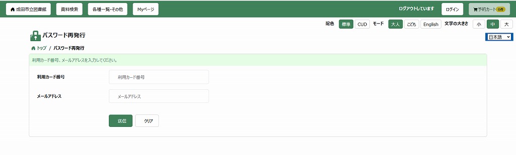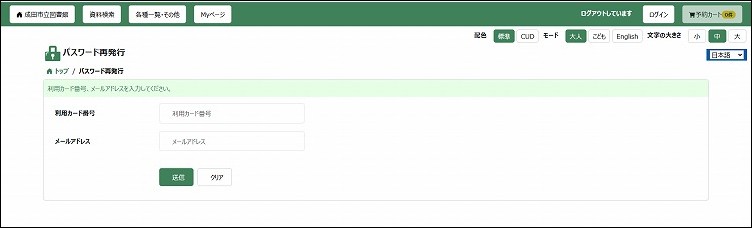 (2)パスワード再発行画面で、利用カード番号とメールアドレスを入力し、送信します。